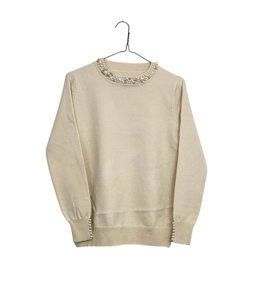 Elegant long-sleeve knit blouse featuring a luxurious pearl
